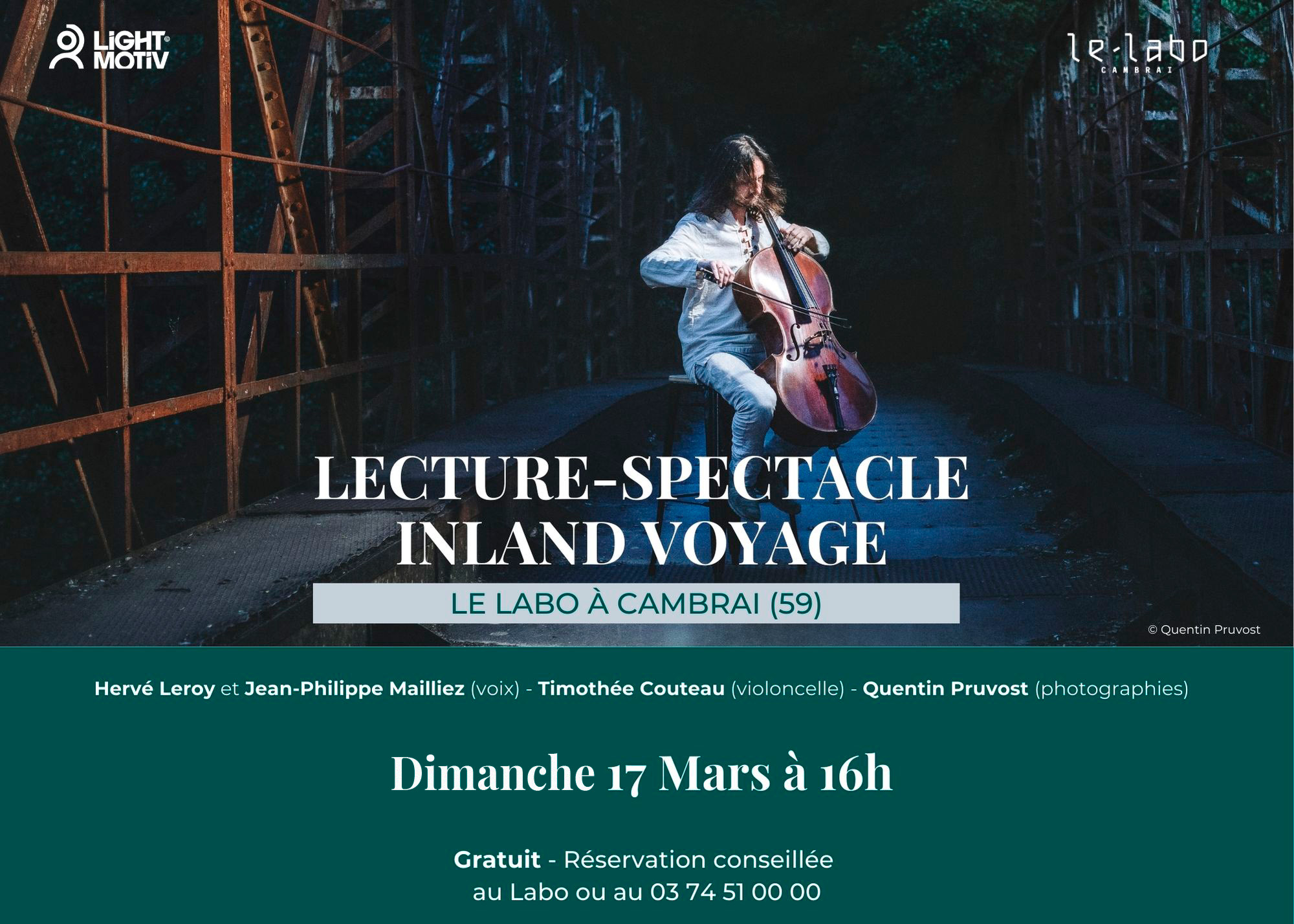 23 février 2024Inland Voyage, Lecture spectacle au Labo à CambraiQuentin Pruvost (photographies), Hervé Leroy et Jean-Philippe Mailliez (voix), Timothée Couteau (violoncelle)