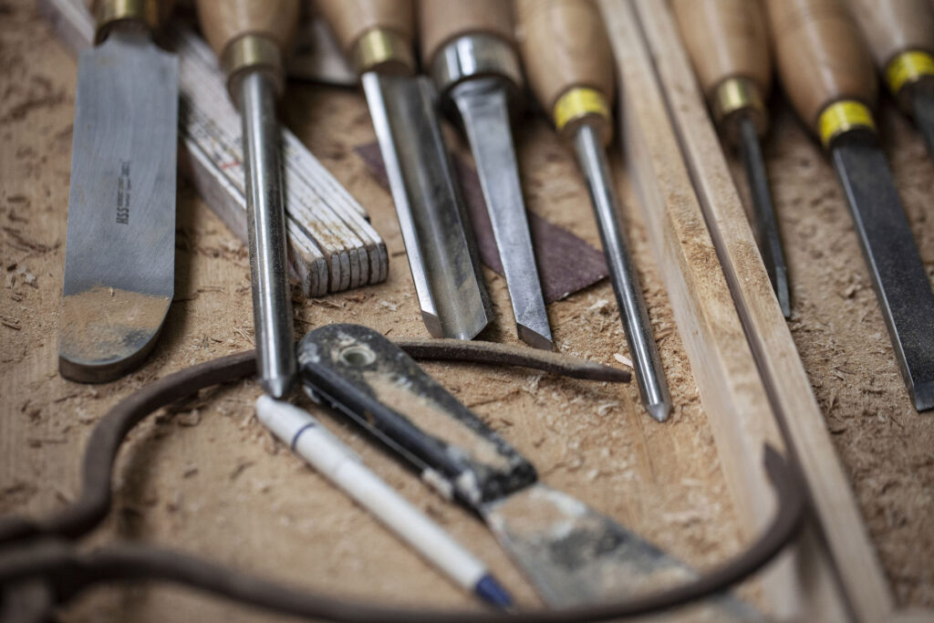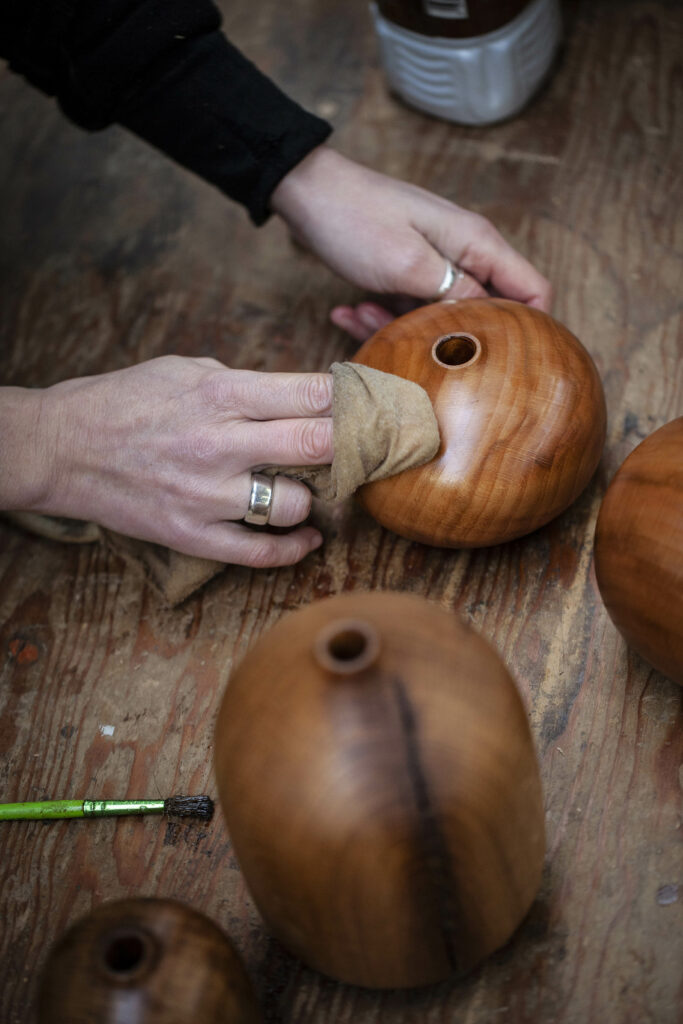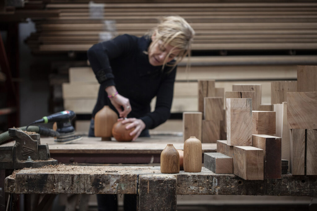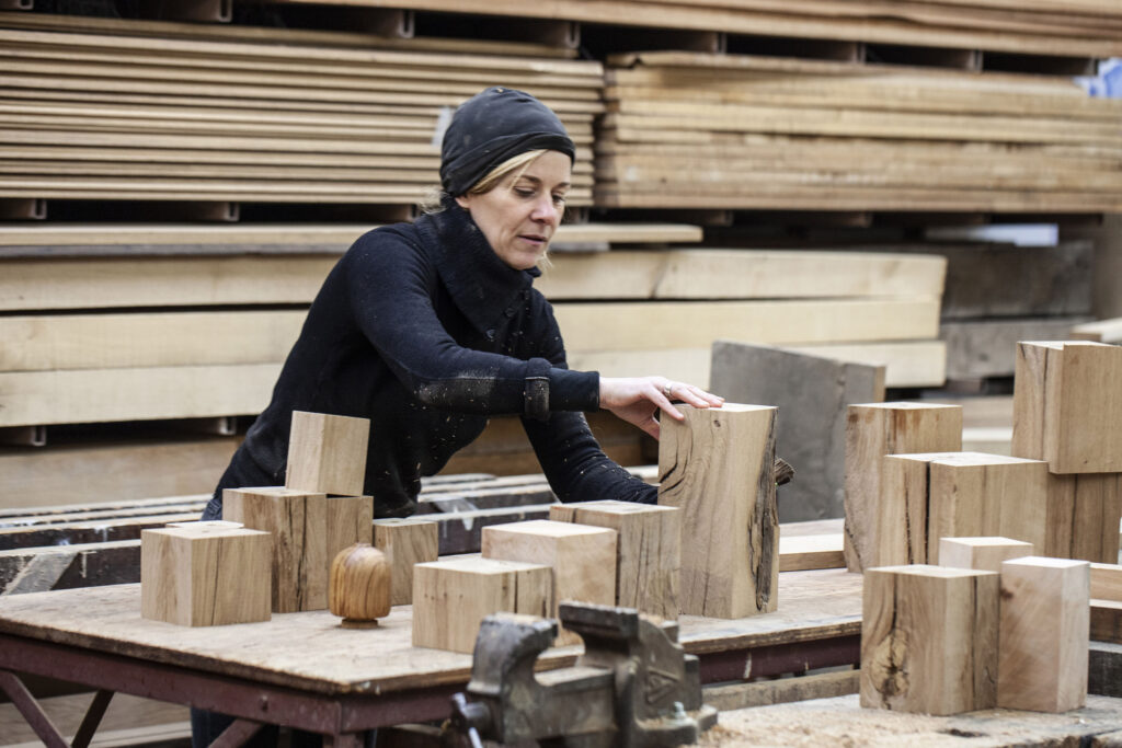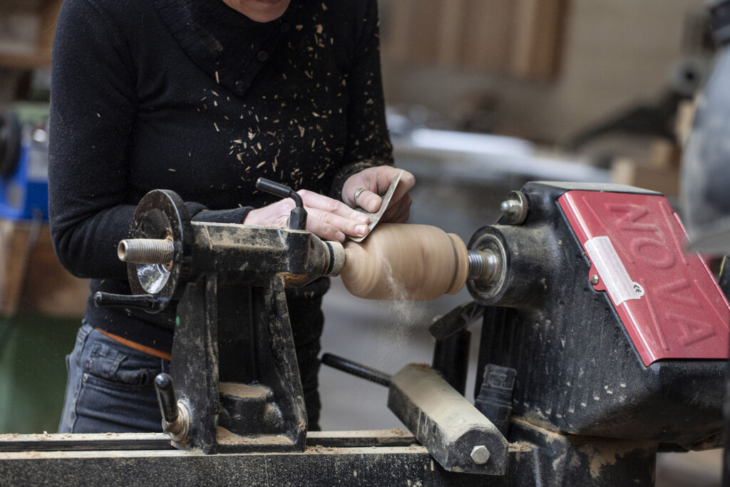 Dans l'atelier de Lucille, tourneuse sur bois, à Locre à la frontière belge.. Dégrossir le bloc de bois. Partager