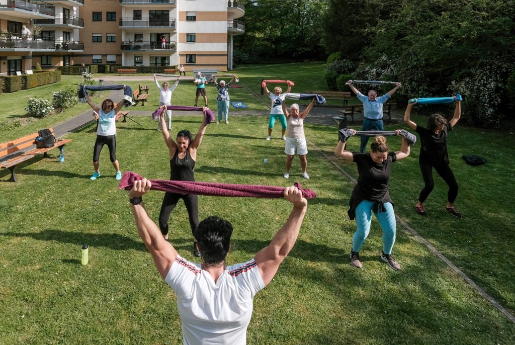 29 avril 2020Florian, coach sportif, a mis en place des cours de fitness pour tout son voisinage. Les gens descendent pour participer ou répètent les mouvements depuis leur balcon. Cet entr'acte dans la journée est très apprécié, c'est un moyen de tromper l'isolement par de nouvelles rencontres. © Thierry Thorel / Light Motiv