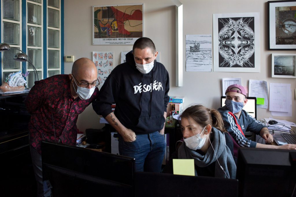 2 mai 2020" Le 1er Mai, on lâche rien, le 2 Mai on continue ". A Arras, dans son appartement, François et l'équipe de Colères du présent, inventent "le Monde d'après" en remplacement du Salon du Livre d’expression populaire et de critique sociale. Sous l'oeil attentif des modérateurs masqués, les débats en direct, les créations d'artistes, les lectures d'écrivains s'enchaînent pendant deux jours et explorent de nouvelles pistes entre utopie et réalité. © Eric Le Brun / Light Motiv