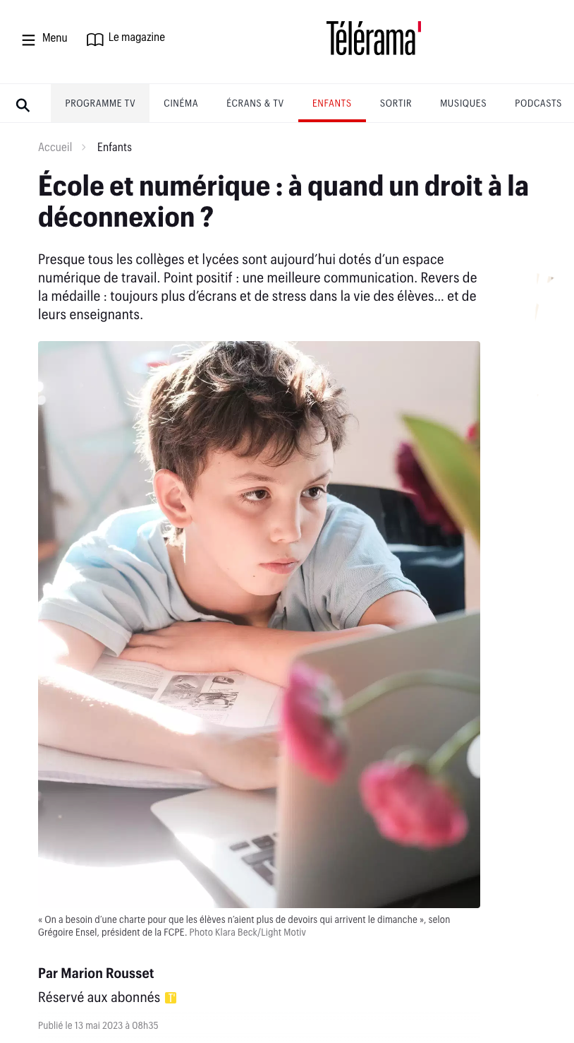 Le magazine Télérama a choisi une photo de Klara Beck pour illustrer son article sur le droit à la déconnexion.