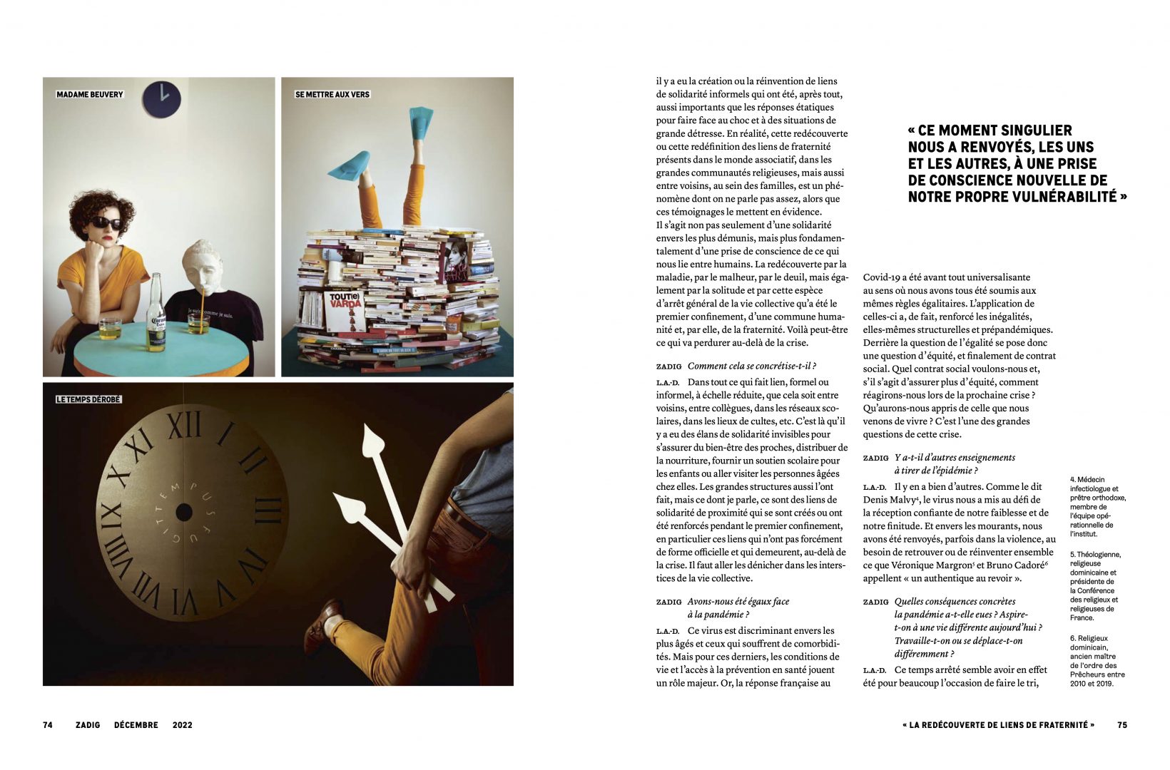Les photographies de la série "Fantaisie impromptue" de Marie-Clémence David ont été sélectionnées pour illustrer l'éclairage de Laëtitia Atlani-Duault, anthropologue, présidente de l'Institut Covid-19 Ad Memoriam de l'université de Paris, dans le dossier de Zadig de Décembre 2022. L'anthropologue revient sur "la création ou la réinvention de liens de solidarités" provoquée par la pandémie.
