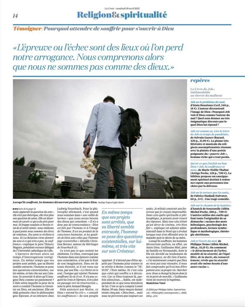 Dans la rubrique 'religion et spiritualité' de l'hebdomadaire La Croix, la photographie de Nadège Fagoo accompagne ce questionnement "pourquoi attendre de souffrir pour s'ouvrir à Dieu ?"
