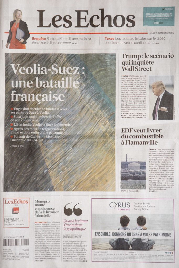 Une belle recherche iconographique : Les Echos ont choisi une image abstraite sur l'eau issue de notre fond pour faire la une concernant la bataille économique en cours entre Veolia et Suez.
