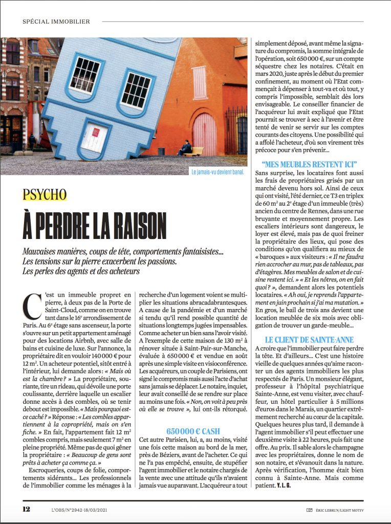 Parue dans L'Obs, cette photographie d'Eric Le Brun, "La maison tombée du ciel", décrit bien les situations abracadabrantes rencontrées par les professionnels de l'immobilier dans un marché très tendu.