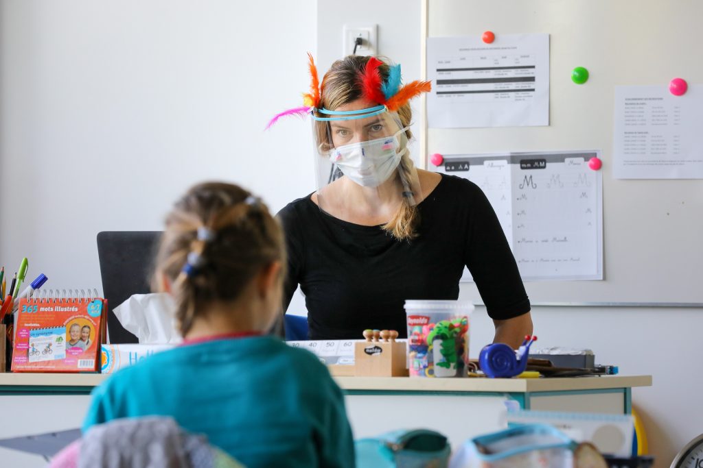 La reprise des classes provoque des scènes surprenantes où les professeurs et l’administration rivalisent d’imagination pour plaire aux élèves, leur faire accepter les nouvelles mesures sanitaires. Une visière devient la coiffure d’une squaw, le marquage au sol ressemble à une marelle, et les masques sont portés par des pirates. Combien de temps encore à déjouer ainsi les gestes barrières et l’inquiétude probable des enfants ?